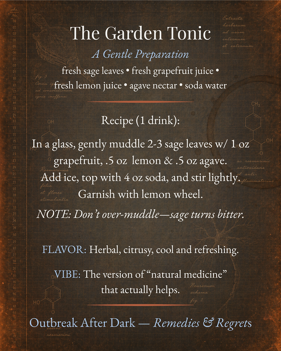Recipes and references appear below the signature. The Traveling Patent Medicine, Garden Tonic, Apothecary Pretzel Knots, and Victorian Lemon Posset are ready when you are.